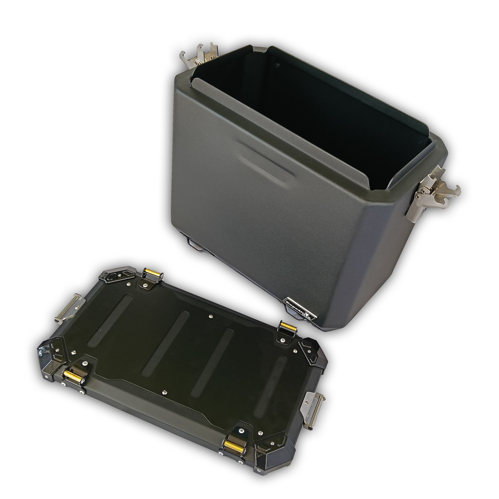 Expedition Cases to solidne, ręcznie robione, sprawdzone w różnych ekspedycjach kufry motocyklowe. Oferowany model to konstrukcja powstała w wyniku wielu testów terenowych i opinii użytkowników. Korpus i pokrywka wykonane z lekkiego aluminium – zaginane, spawane i malowane proszkowo. Zamki - stal nierdzewna. Takie połączenie materiałów gwarantuje doskonałą trwałość, bardzo wysoką wytrzymałość na uszkodzenia mechaniczne, zewnętrzne warunki atmosferyczne oraz niską wagę. Możliwość łatwej wymiany poszczególnych elementów, nawet w warunkach polowych. Aluminiowa płyta na pokrywce izolująca bagaż od bardziej szorstkiego lakieru. W środku dno wyłożone miękką, wyciszającą matą. Dolne krawędzie zostały ścięte co pozwala na większy przechył w zakrętach i znacząco podnosi sztywność. Podwójne uszczelnienie w każdym miejscu łączenia. Podkładki dzięki którym kufry można stawiać bez obawy o uszkodzenie na twardych podłożach.
